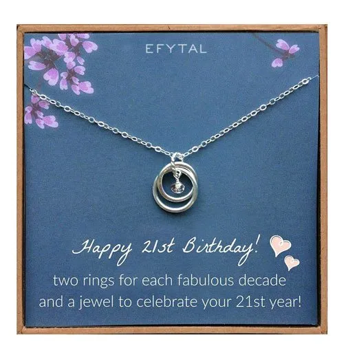 A special 21st birthday present for any birthday girl in your life, this sterling silver jewelry is sure to be loved and cherished forever. Made to celebrate their milestone birthday, this necklace features two rings, one for each decade and a colored crystal for the extra year. A beautiful gift for any daughter or loved ones, they’re sure to wear this special birthday gift with every outfit.