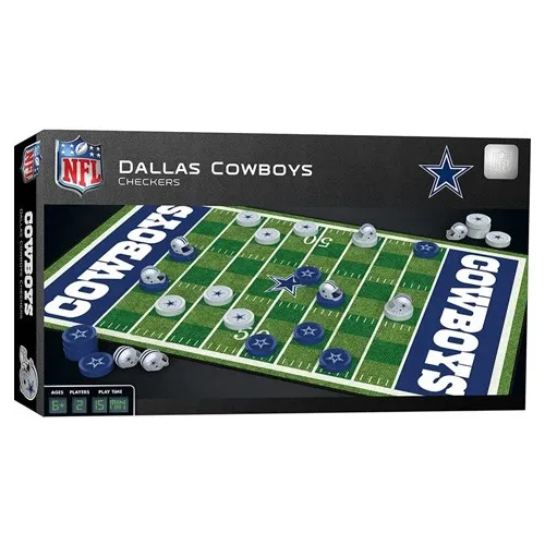 For any Dallas Cowboys fan, this officially licensed NFL product is a must-have. The game board is a realistic checkerboard with team color end zones and the checkers pieces are Dallas Cowboys helmeted checkers pieces that snap securely into place. The king checkers piece even has a Dallas Cowboys football helmet that snaps on and off. The game includes 24 checkers pieces, 8 football helmet king pieces, 13 inch x 21 inch game board, sticker sheet and instruction sheet.
