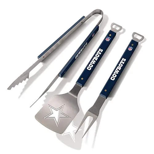 Looking for a gift for the diehard football fan in your life? Check out this officially licensed set of sportula barbecue tools! Made from heavy-duty stainless steel with brass-riveted handles, this set includes a sportula, a pair of tongs, and a grill fork. The team name is stamped on the handles, and the team logo is laser-cut through the blade of the sportula. The sportula and the fork both come with an integrated bottle opener.
