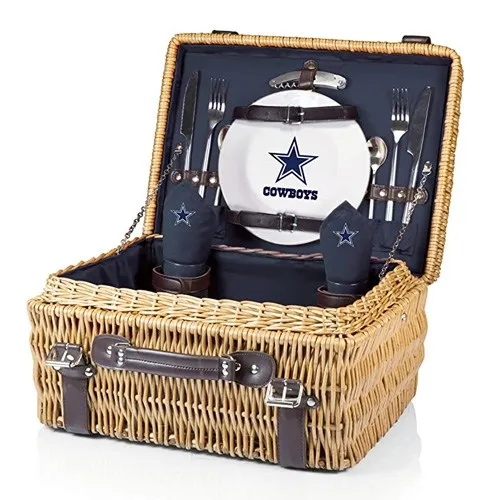 This attractive suitcase design picnic basket is perfect for any NFL fan. The basket comes with a deluxe picnic service for two, including plates, glasses, utensils, and napkins. The team’s logo is featured on the leatherette patch on top, on the plates, and on the napkins. The basket is also lined with a coordinating solid-colored lining and napkins. It measures 16 by 12 by 8 inches and makes a great gift.