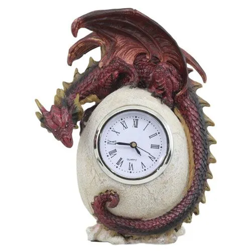 Hand-painted and polished to perfection, this Red Ember Dragon Protecting Egg Table Clock will delight any dragon lover. The battery-operated clock is easily removed to expose the battery chamber. It weighs just 1.3 lbs, and the top-notch quality resin three-dimensional figurine makes it an extraordinary table ornament for your dragon loving friends.