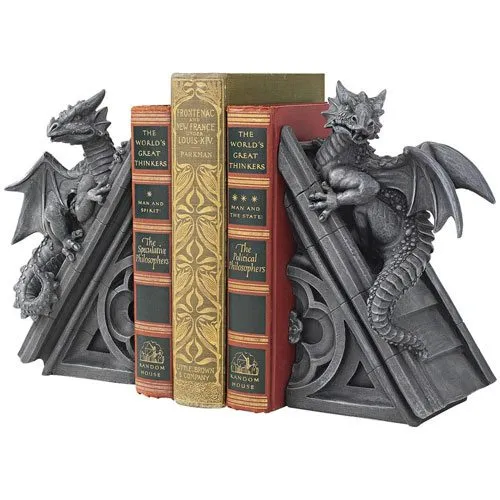 Surprise your friends or family with these two fire breathing gothic dragons, hand-crafted with real crushed stones and bonded with superior-quality resin. Guard your magical tomes with great aplomb and ferocity. The dragon figurine bookend set towers a whopping 8 inches in height and casts an umbra over anyone who dares venture into the library without your permission.