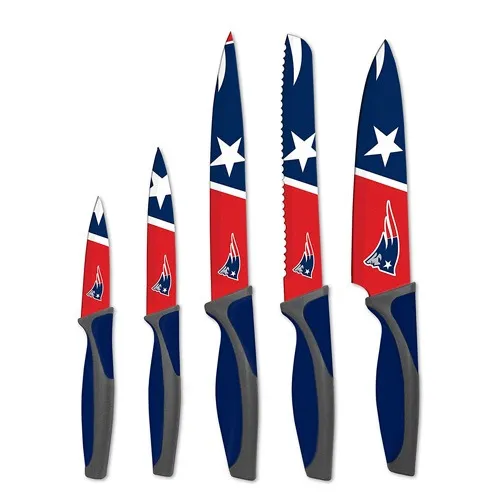 The Sports Vault 5-Piece Kitchen Knife Set is the perfect gift for the avid sports fan or aspiring chef in your family. This set features high-quality 430 stainless steel blades with New England Patriots printed artwork on both sides of each knife. The easy to clean hand wash only requires soap and water for best results and makes this a great gift for any occasion.